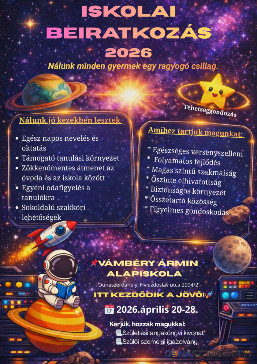 A Vámbéry Ármin Alapiskola beíratása 2026. április 20. és 28. között zajlik az iskola olvasótermében és díszcsarnokában (Hviezdoslav utca). A szülőket és gyermekeket munkanapokon 7:30 és 16:30 között, szombaton pedig 8:00 és 12:00 között fogadják, az ünnepélyes, programokkal egybekötött beiratkozásra április 20-án kerül sor.
