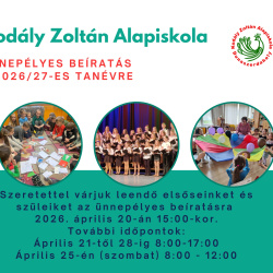 A Kodály Zoltán Alapiskola különösen gazdag programkínálattal készül a beíratás időszakára. Az ünnepélyes beiratkozás 2026. április 20-án 15:00 órakor kezdődik, ezt követően április 21–28. között naponta 8:00 és 17:00 között, valamint április 25-én, szombaton 8:00 és 12:00 között várják a szülőket.