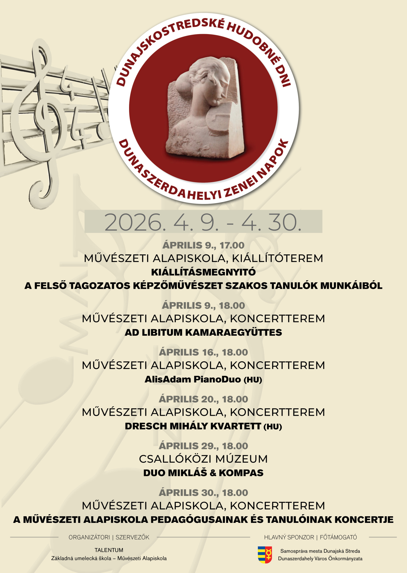 A programsorozat ünnepélyes megnyitója április 9-én, 17 órakor lesz a Művészeti Alapiskola kiállítótermében, ahol a felső tagozatos képzőművészet szakos tanulók munkáiból nyílik tárlat. Az est 18 órakor a koncertteremben folytatódik, ahol az Ad Libitum kamaraegyüttes lép színpadra.