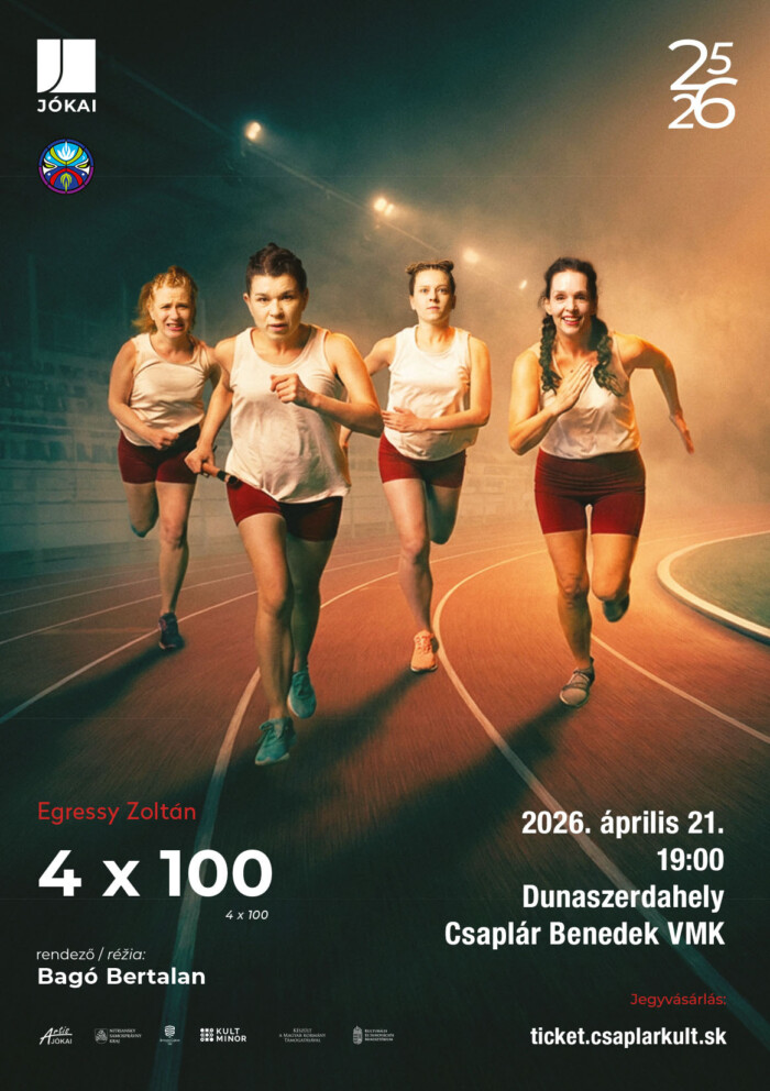 Sportolókról, mégsem elsősorban a sportról szól Egressy Zoltán 4x100 című színpadi játéka a Komáromi Jókai Színház művészeinek előadásában. A tragikomédia egy gyúrószobában, valamint egy stadion melegítőpályáján játszódik napjainkban, Budapesten. A négy sprinternő (Perec, Grafika, Hóvirág és Kiseszter) mellett két további szereplő tűnik fel a darabban: a varázsos Dali gyúró, és Dzsudi néni, az edzőnő.