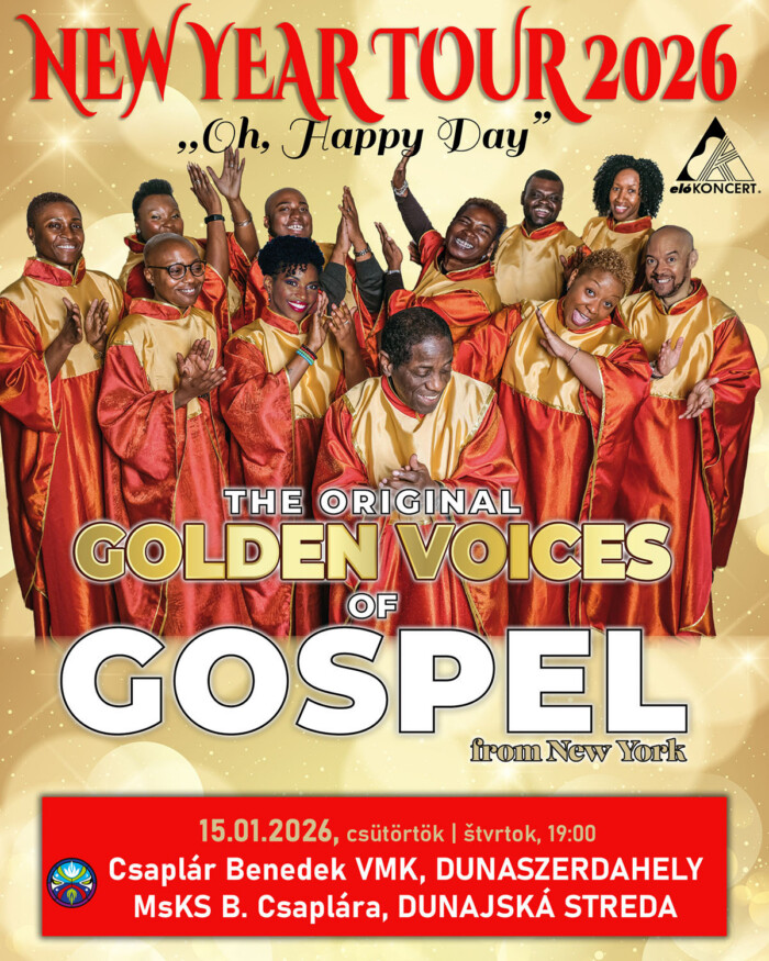 2026 január 15-én, 19:00 órai kezdettel Dunaszerdahelyen a Csaplár Benedek VMK színháztermében tekinthető meg a népszerű együttes autentikus ÚJÉVI GOSPEL GÁLA koncertje. Az élményhez jó szórakozást kívánnak a szervezők, a Csaplár Benedek VMK munkatársai valamint az elóKONCERT iroda.