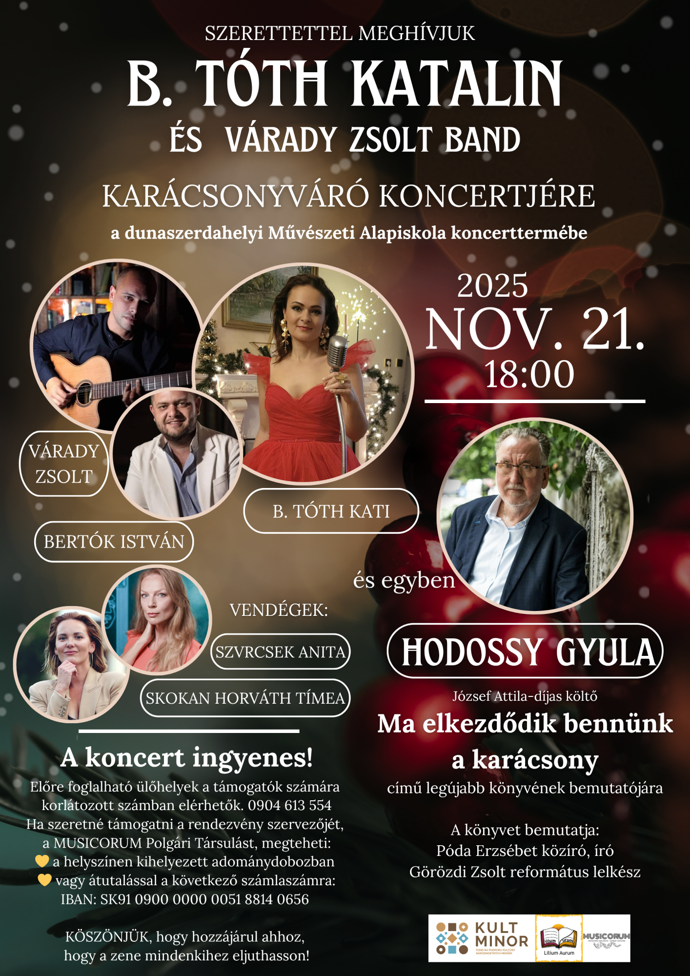 A koncert egyúttal Hodossy Gyula József Attila-díjas költő legújabb kötetének, a „Ma elkezdődik bennünk a karácsony” című verseskönyvnek a bemutatója is lesz.