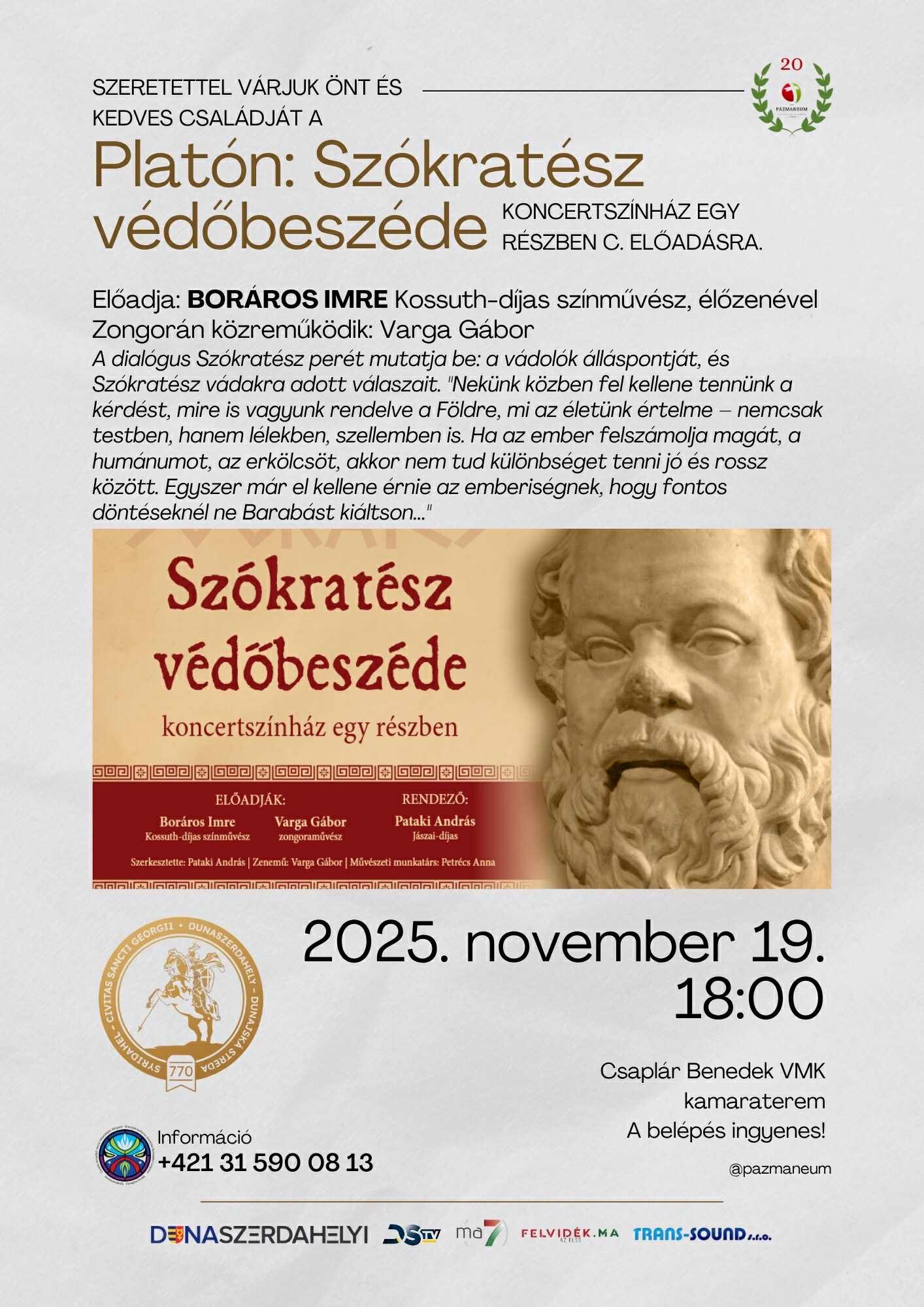 A darabot Boráros Imre Kossuth-díjas színművész adja elő, aki ezúttal is felejthetetlen tolmácsolásban kelti életre az ókori filozófus alakját. Az est hangulatát Varga Gábor zongoraművész játéka teszi teljessé.