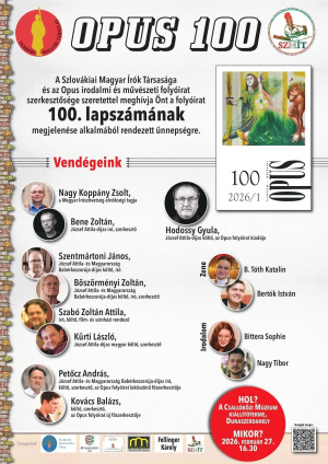 Különleges irodalmi eseménynek ad otthont Dunaszerdahely: megjelenik az Opus irodalmi és művészeti folyóirat 100. lapszáma, amelynek tiszteletére ünnepséget szervez a Szlovákiai Magyar Írók Társasága és az Opus szerkesztősége.
