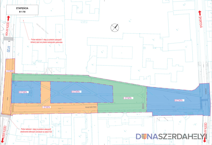 Tekintettel arra, hogy nagy beruházásról van szó, a megvalósítás három etapban valósul meg (lásd a képen!), azzal a céllal, hogy a környező intézmények – a gimnázium, a közös igazgatású szakközépiskola, a speciális óvoda és iskola, az ügyészség és a hivatalok – folyamatosan működni tudjanak. A hétköznapi forgalmat is a lehető legkisebb mértékben igyekszünk majd korlátozni, és az egyes ütemek megkezdése előtt a lakosságot előre tájékoztatjuk a forgalmi rend változásairól.
