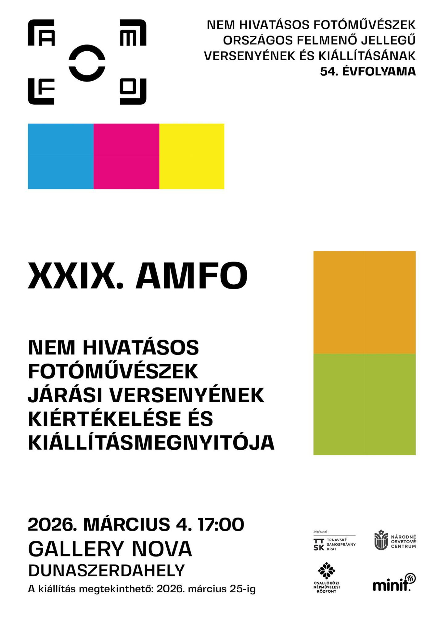 Nagyszombat Megye Önkormányzata és a dunaszerdahelyi Csallóközi Népművelési Központ szeretettel meghívja Önt a nem hivatásos fotóművészek járási versenyének kiértékelésére és kiállításmegnyitójára, a XXIX. AMFO programjára.